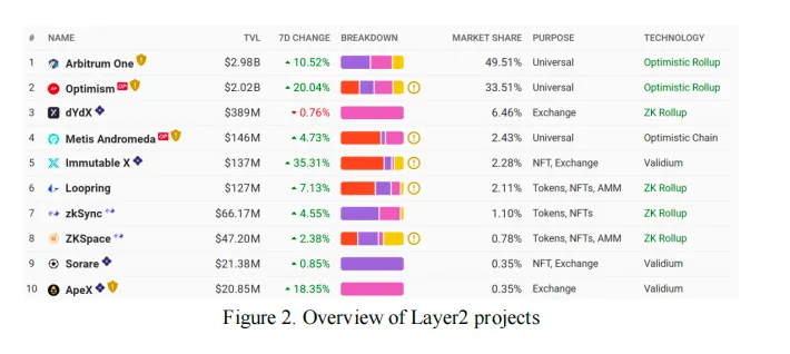 Currently, Arbitrum is the project with highest TVL in Ethereum’s Layer 2 scaling solution, reaching $2.98B, accounting for 3.01% of all networks combined, and 49.51% in Layer2. Arbitrum Rollup is an off-chain protocol managed by on-chain Ethereum contracts, to be precise, Arbitrum is not a blockchain but an off-chain transaction uploaded to the main Ethereum network through a compression algorithm. This approach can partially solve the congestion problem faced by Ethereum, in order for creation of advantages on fast transaction, low gas fee, security guarantee and good user experience.
