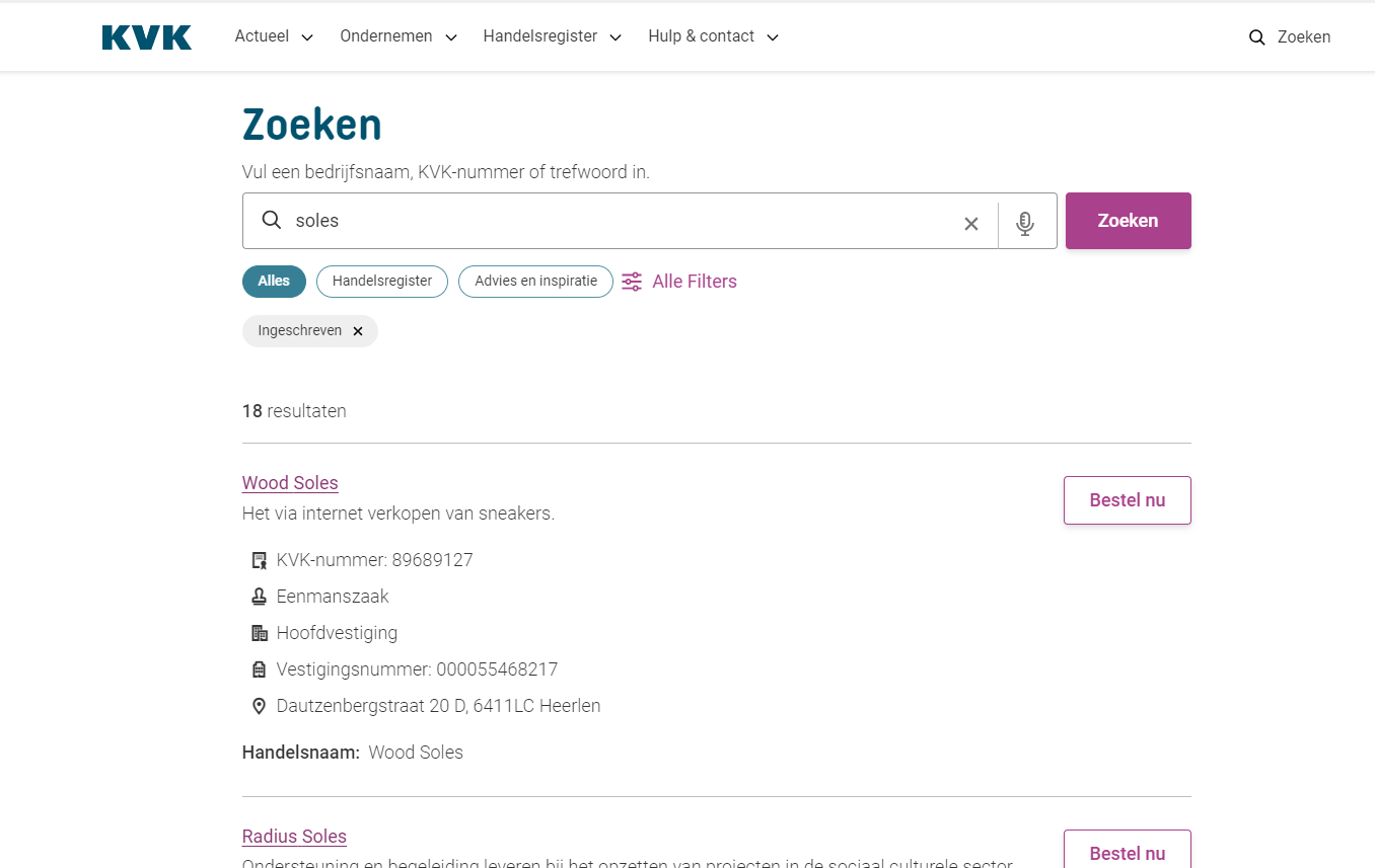 Cuando una empresa se refiere a su información legal expone claramente su nombre comercial, así como números de registro, regulaciones o licencias. En este caso, Solesbot se refiere así misma como Soles BOT, una compañía de responsabilidad limitada incorporada bajo las leyes de los países bajos. Las compañías de responsabilidad limitada en países bajos utilizan la abreviatura BV (“Besloten Vennootschap”) para indicar el tipo legal de una empresa. Si Solesbot esta en lo correcto entonces debería aparecer registrado en el registro mercantil de países bajos cuya web oficial te la dejo a continuación:
