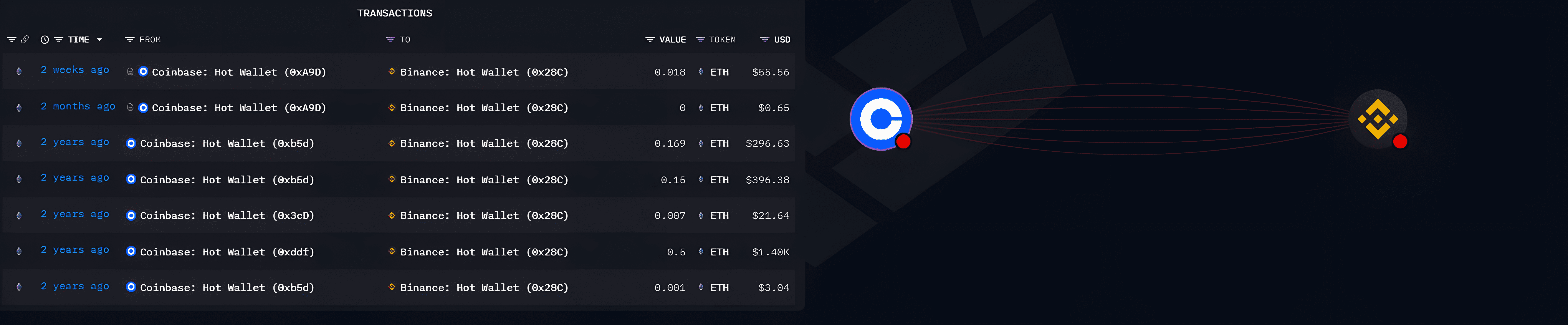 No necesariamente quiere decir que hay arbitrajes. Vemos que las transferencias de esa hot wallet de Coinbase a la hot wallet de Binance señalada anteriormente datan de hace 2 años, 2 meses y dos semanas en cantidades relativamente bajas si tenemos en cuenta el volumen que esta moviendo Solesbot, ya que vemos transferencias que van desde los 0.65 usd hasta los 1400 usd. Los retiros grandes son hacia las direcciones acumuladoras de fondos.