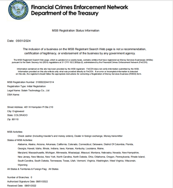 Puede realizar una consulta en la pagina web del Sistema nacional de licencias multiestatales (NMLS) cuya pagina web es https://www.nmlsconsumeraccess.org/. Encontraras información de proveedores de servicios financieros y también MSB. Puedes buscar a la compañía por diversos ítems como el nombre o el numero de licencia. Evidentemente Solain no apareció.