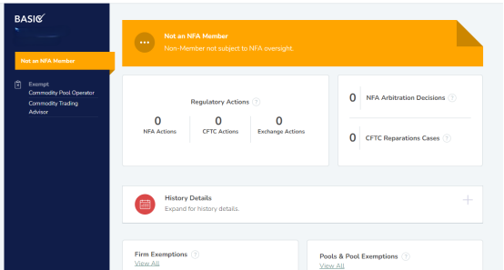 Cuando una empresa hace un registro en esta entidad lo normal es que le den un ID para poder consultarlo desde la pagina web oficial (https://www.nfa.futures.org/basicnet/), sin embargo no quiere decir que automáticamente cuenta con el permiso de la NFA o la licencia para desarrollar sus actividades. Encaso de un presunto fraude, si buscas a la empresa en la pagina web de este ente gubernamental te encontraras con lo siguiente: