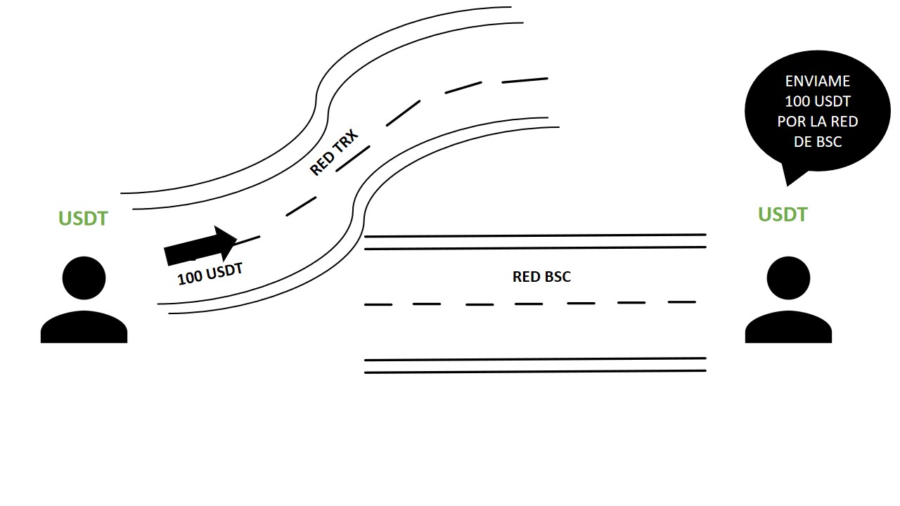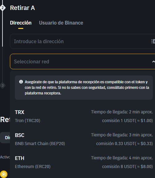 Si leíste “Token y criptomoneda son los mismo?” te habrás enterado que una criptomoneda tiene su propia red o su propia blockchain y un token debe usar la red de una criptomoneda para poder hacer transferencias con ellos. Es así como podrías enviar bitcoin a través de la red de Bitcoin o ether a través de la red de Ethereum. Para nuestro ejemplo enviaremos USDT que es un token. Ahora debes elegir la red por la cual enviaras los USDT. Debes tener en cuenta que las dos personas que harán la transacción deben tener claro que moneda y red se utilizaran ya que de haber un error los fondos podrían no llegar a su destino: