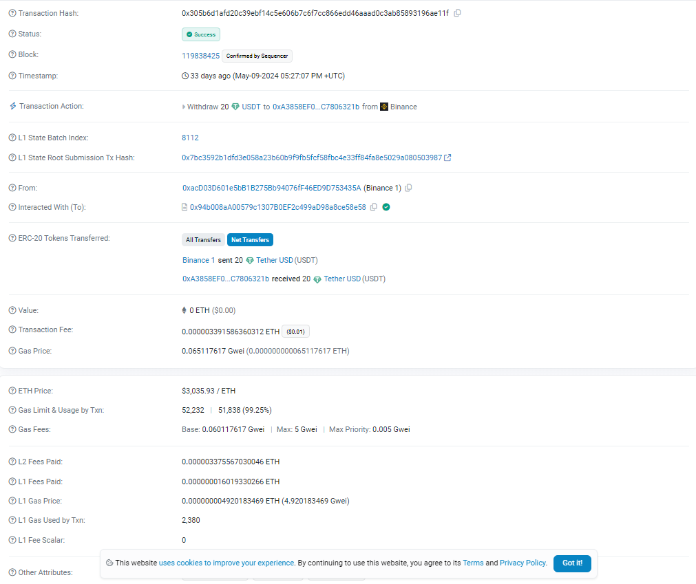 L1 y L2 fees paid. Comisiones de capa 1 y capa 2 pagadas por la transacción. Si no comprendes lo que significa capa 1 y capa 2, en un futuro habrá una entrada dedicada a explicarlo así que no te preocupes.