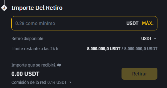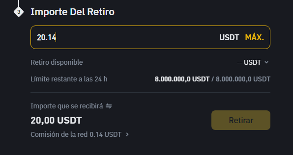 Dependiendo de la red y del Exchange tendrás una cantidad mínima de criptomoneda a enviar. Para este caso podría enviar mínimo 0.28 USDT y el Exchange me cobraría 0.14 USDT, por lo tanto al destino le llegarian 0.28 - 0.14 = 0.14 USDT.