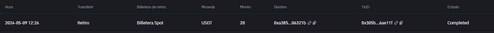 Entonces el costo real de realizar esta transacción de 20 USDT fue de 0.010 usd y esto va incluido en los 0.14 USDT que nos cobro el Exchange por realizar el retiro.