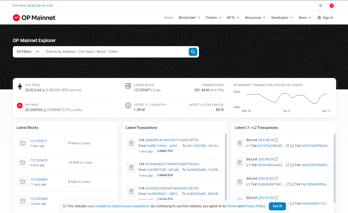 Para este ejemplo usamos la red de Optimism y su explorador de bloques te lo muestro continuación: