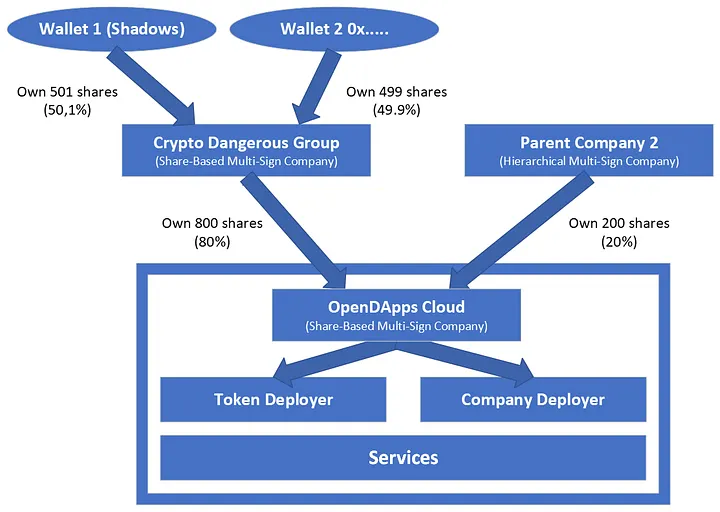 Decentralized companies on OpenDApps are really powerful and can create structures not accessible to developers and organizations using simple DAOs. OpenDApps Cloud provides customers with three main options or ownership of deployed decentralized companies.