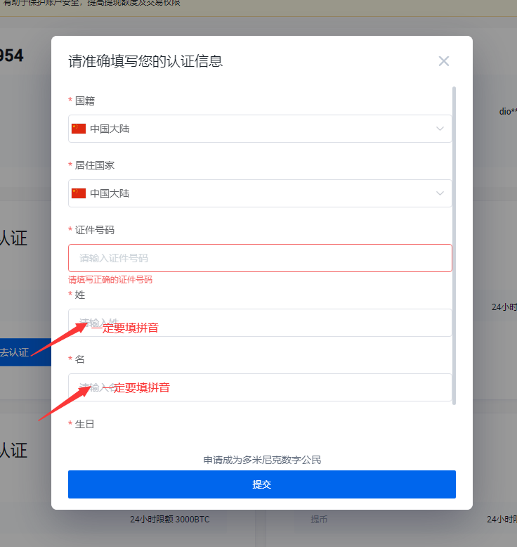 2、点击L1认证,认证信息这里要特别注意,一定要选择中国大陆,然后姓和名都要用拼音,最后点击完成就自动给你多米尼克数字身份了,这个数字身份,以后肯定会很有用。提交之后就留完事了。