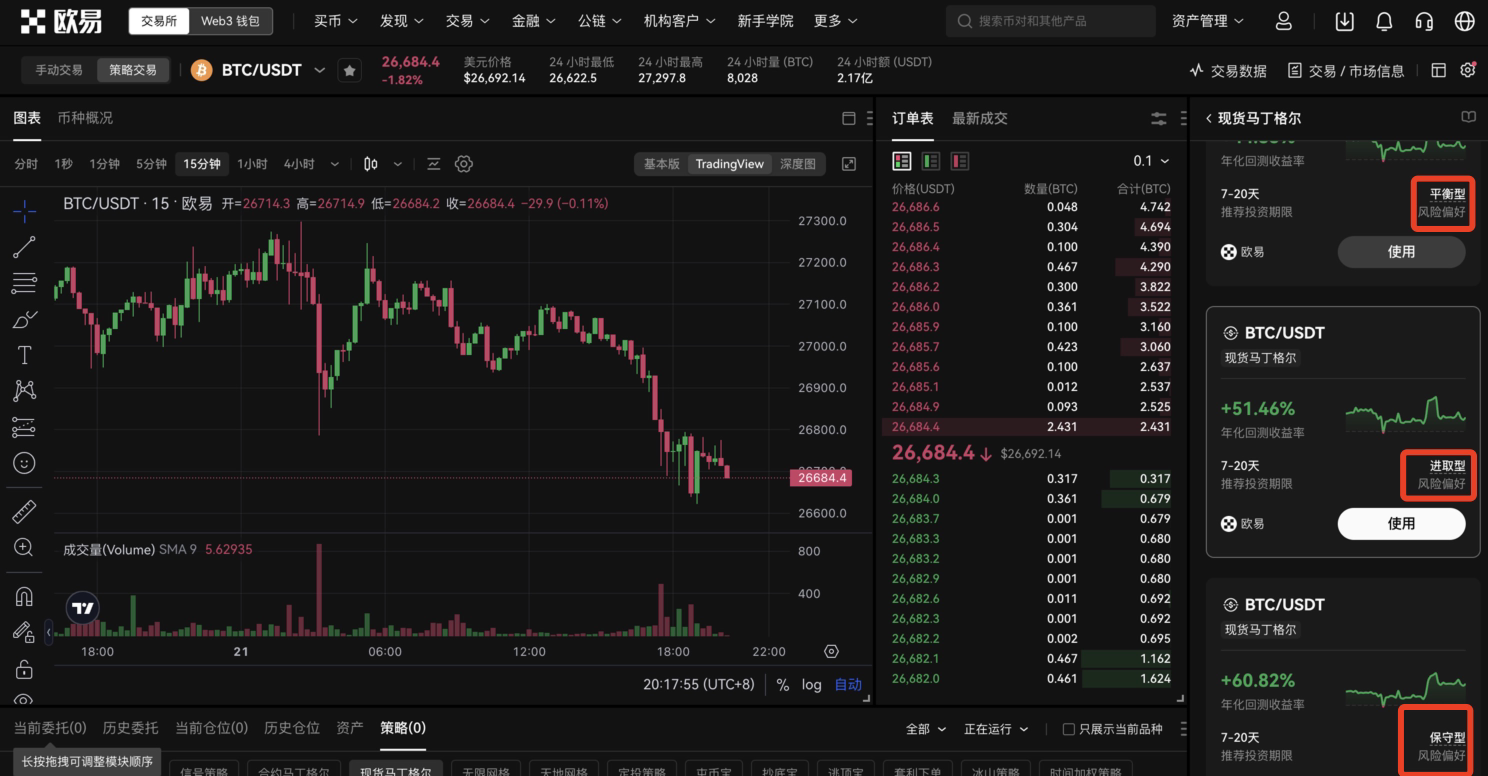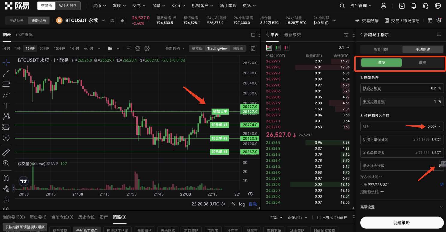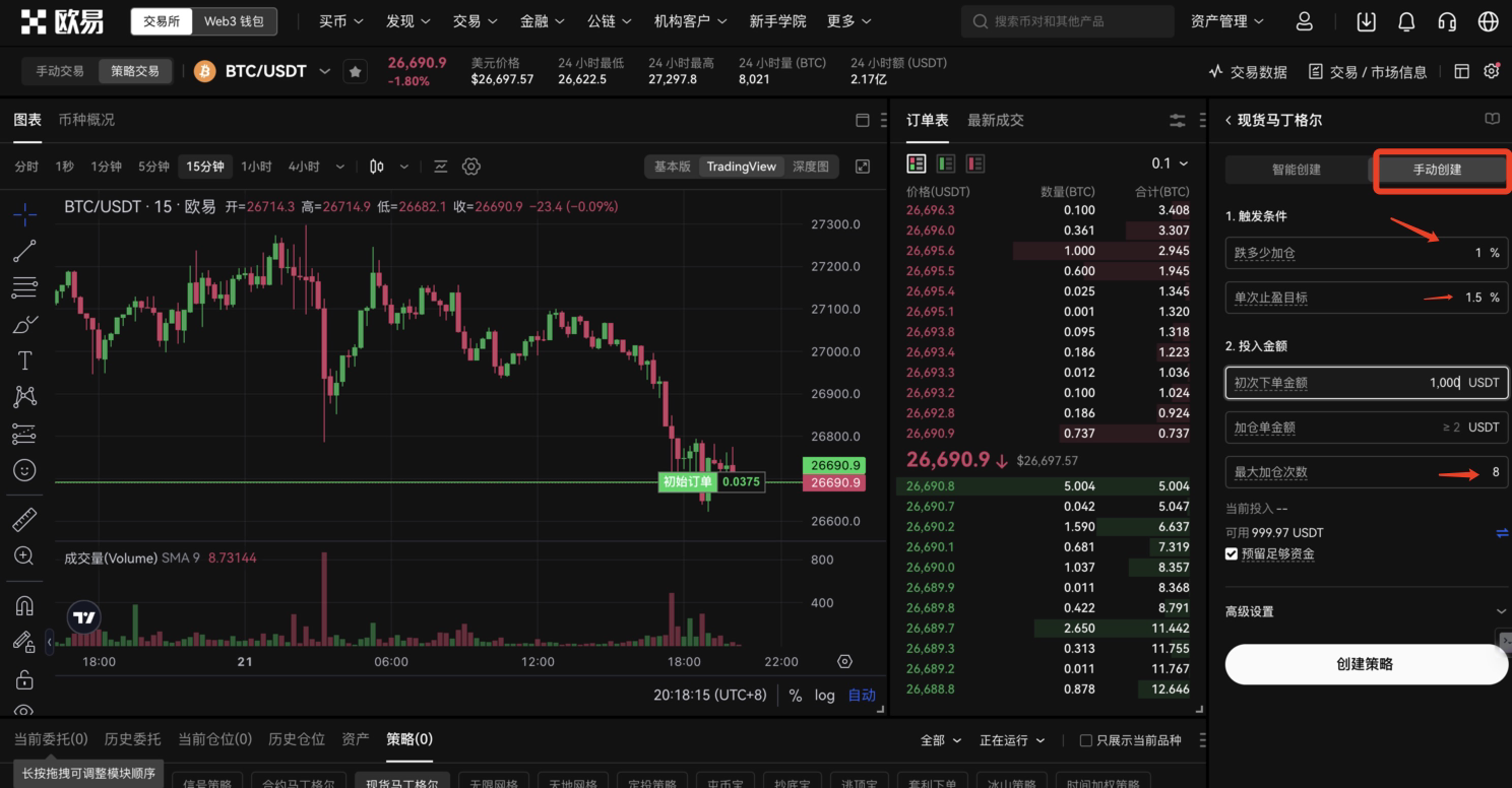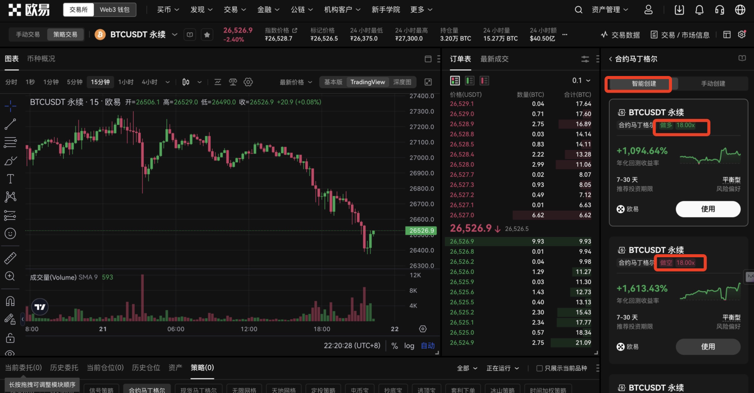 OKX 策略交易中有两个马丁格尔策略一个是现货,一个合约,大家可以根据自己的情况选择。