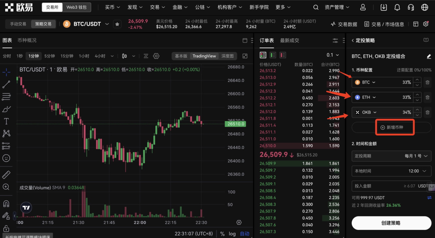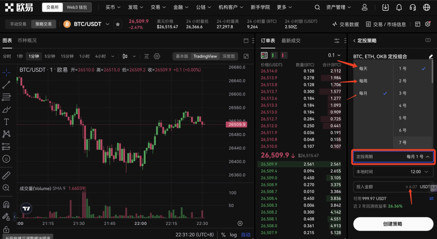 定投策略你可以同时选上几种优质币种,或者你看好的下个风口的币,提前埋伏。建议选3-5个平坦,可以把主要的币调高仓位。(图1)而且也可以选择每天/每周/每月具体的时间自动购买,完全不需要自己在操作十分的方便
