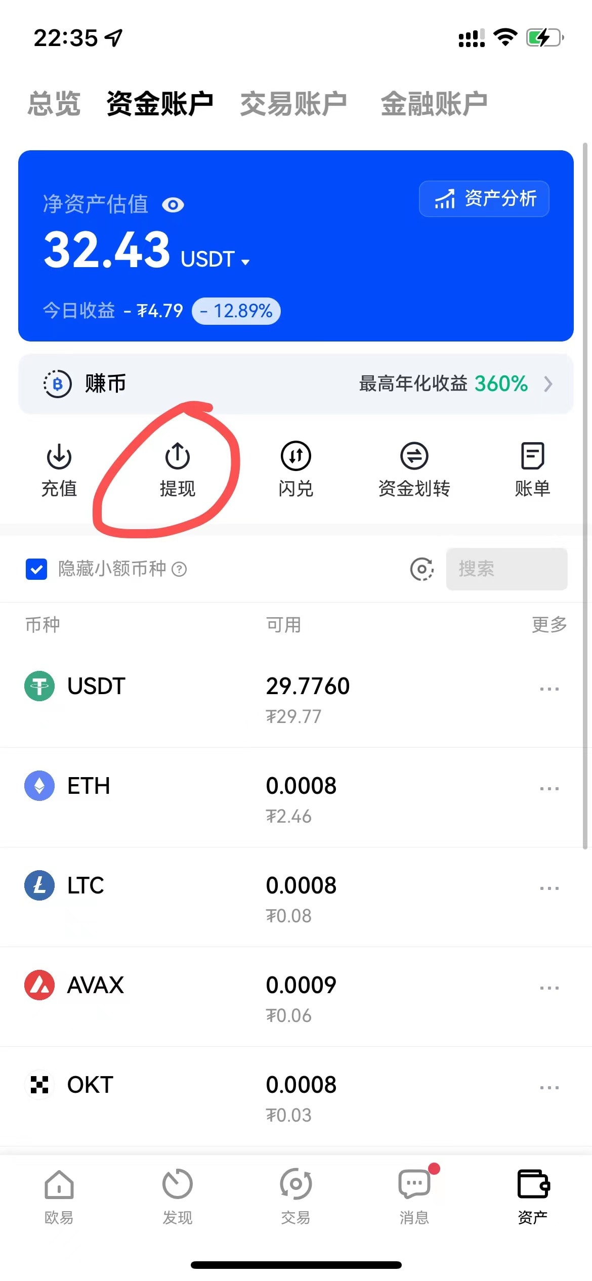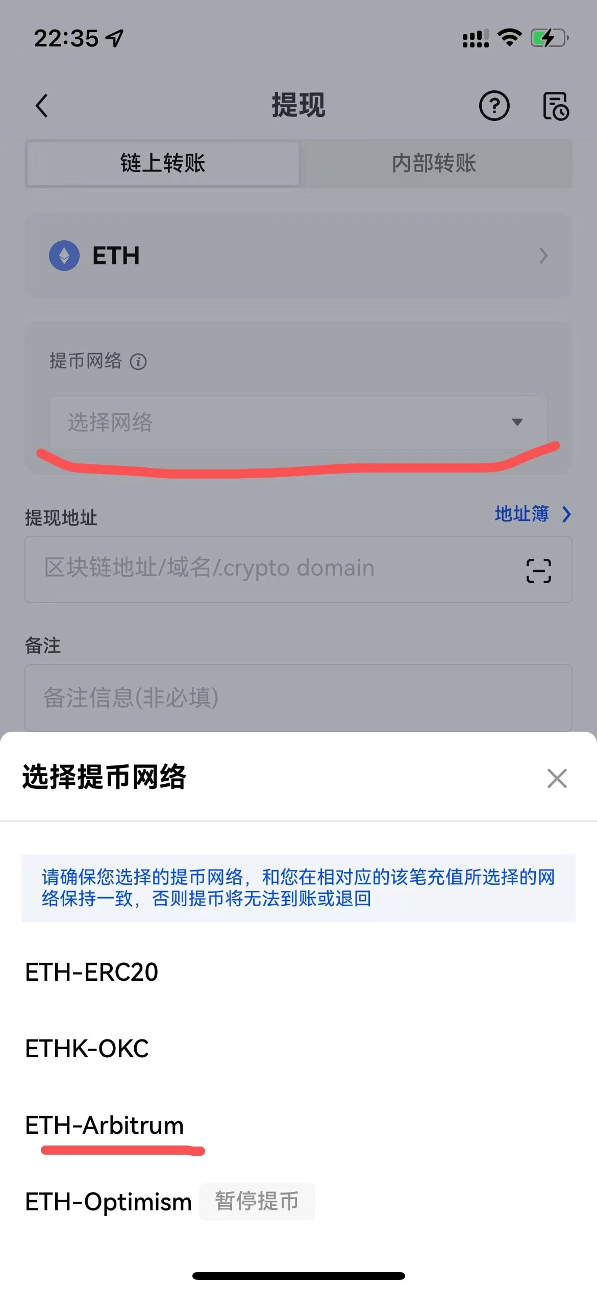 一、首先从交易所出金,以OK为例在资金账户中选择ETH,通过Arbitrum发送到自己的钱包