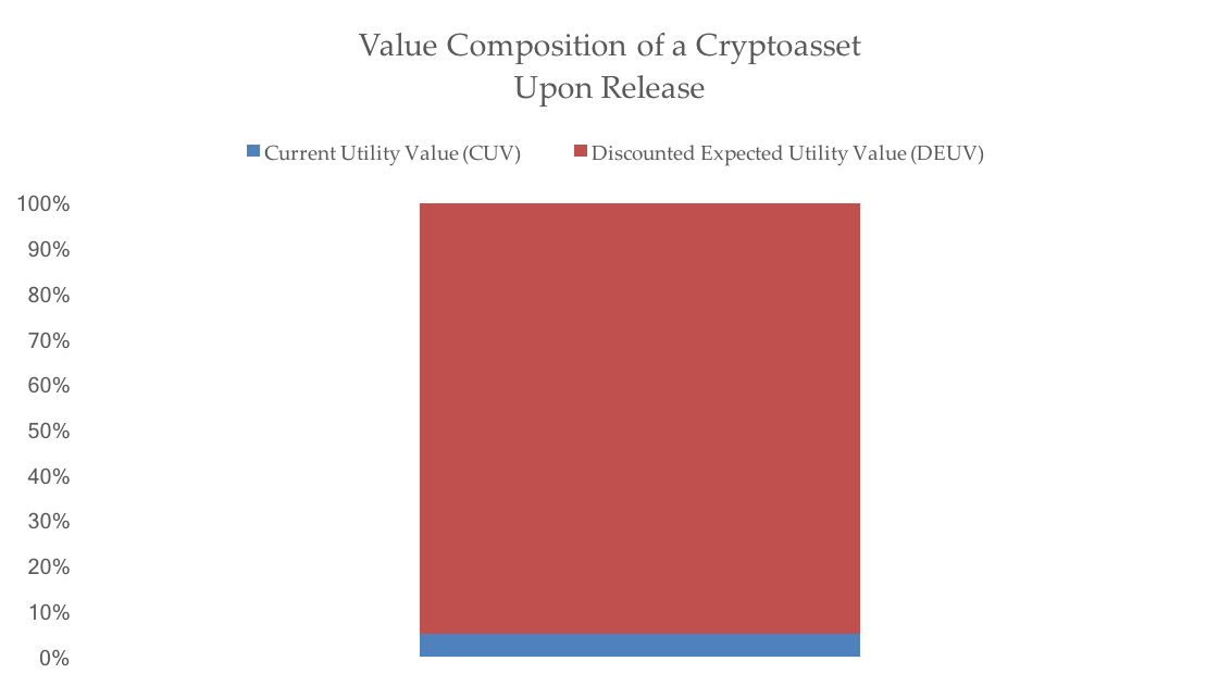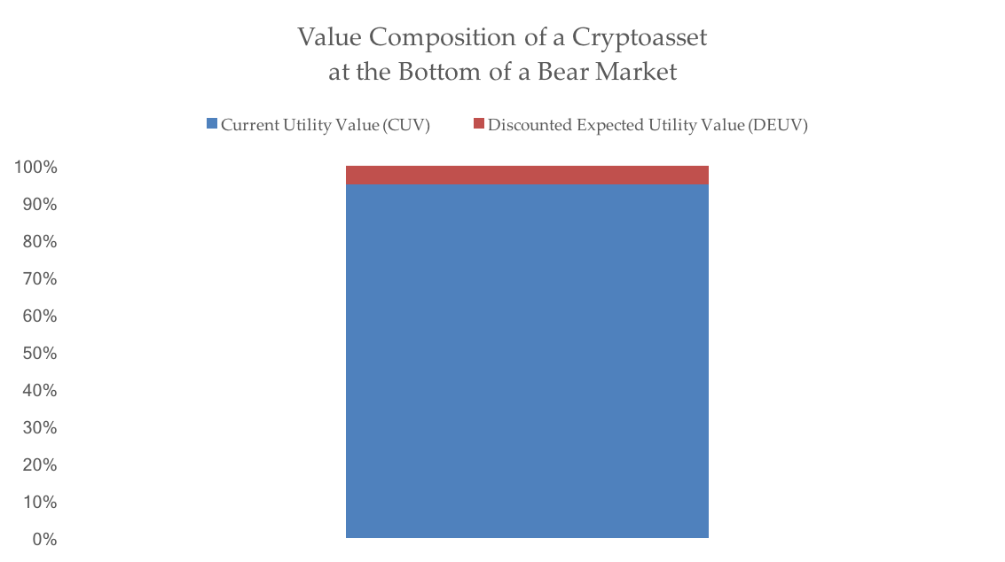 请注意,在上图中,"高%DEUV,低%CUV "是指价格的百分比构成,而不是绝对值。从我对不同的加密资产进行估值的工作来看,在早期,价值构成看起来像下面这样的情况并不少见。初始价格膨胀—DEUV膨胀。