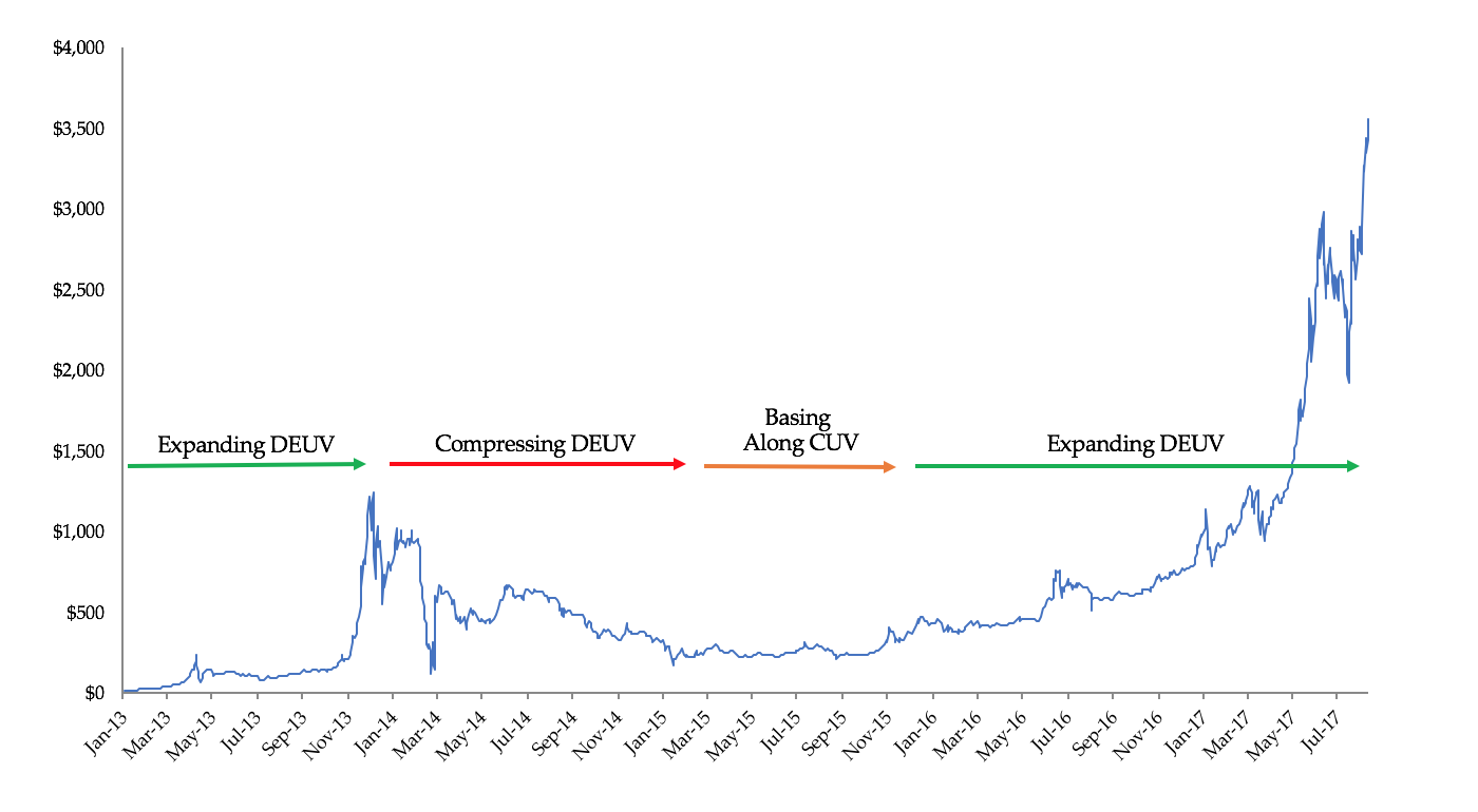 从J型曲线的底部上升可能是一个缓慢的过程,有一个漫长的上坡。当市场先生醒悟到资产的CUV不断增长,为价格注入更多的DEUV时,曲线将开始变陡。这样一个过程是上述三种情况的反面,也许是因为贴现率降低了,或是目标市场的预期渗透率扩大了,或者对总的可处理市场的乐观情绪增长了。无论你如何切分,DEUV都会在CUV增长的基础上随着对未来效用价值的预期而扩大。下面显示了比特币从2013年开始到现在的发展情况。