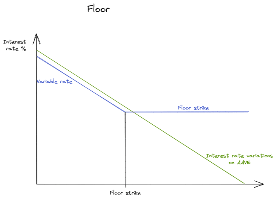 Floor = 看跌期权,决定了一个人希望以什么利率借钱以换取权利金,(向下)超过这个利率的风险由卖方承担。因此,买方肯定能够以高于行权利率的利率借钱。(相当于利率看跌期权)。