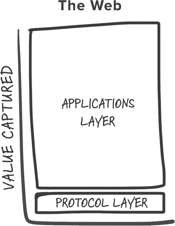 有一种角度可以思考互联网与区块链的不同之处:上一代共享协议产生了不可估量的价值,如TCP/IP协议,HTTP协议,SMTP协议等,但是大部分协议的价值都被应用层所捕获并将其不断聚合在顶部,主要是以数据的形式(想想Google, facebook等公司)。就价值的分配方式来看,互联网堆栈则是由“瘦”协议和“胖”应用所组成。随着市场的发展,我们了解到,投资于应用产生高回报,而直接投资于协议技术通常产生低回报。