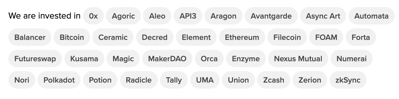 在胖协议公布不久之后,Joel Monegro与合伙人Chris(负责方舟基金的加密货币投资业务)一起成立了placeholder基金。该基金投资了API3/Kusama/zkSync等多项知名项目,以下是其投资组合: