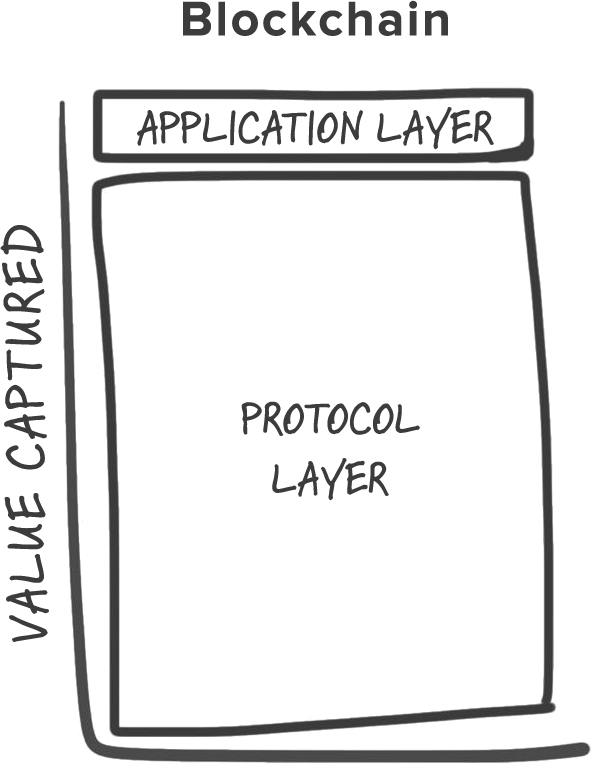 在区块链应用堆栈中, 协议与应用的这种关系是相反的。价值主要集中在共享协议层,只有一小部分分布在应用层,它是一个具有"胖"协议和"瘦"应用的堆栈。
