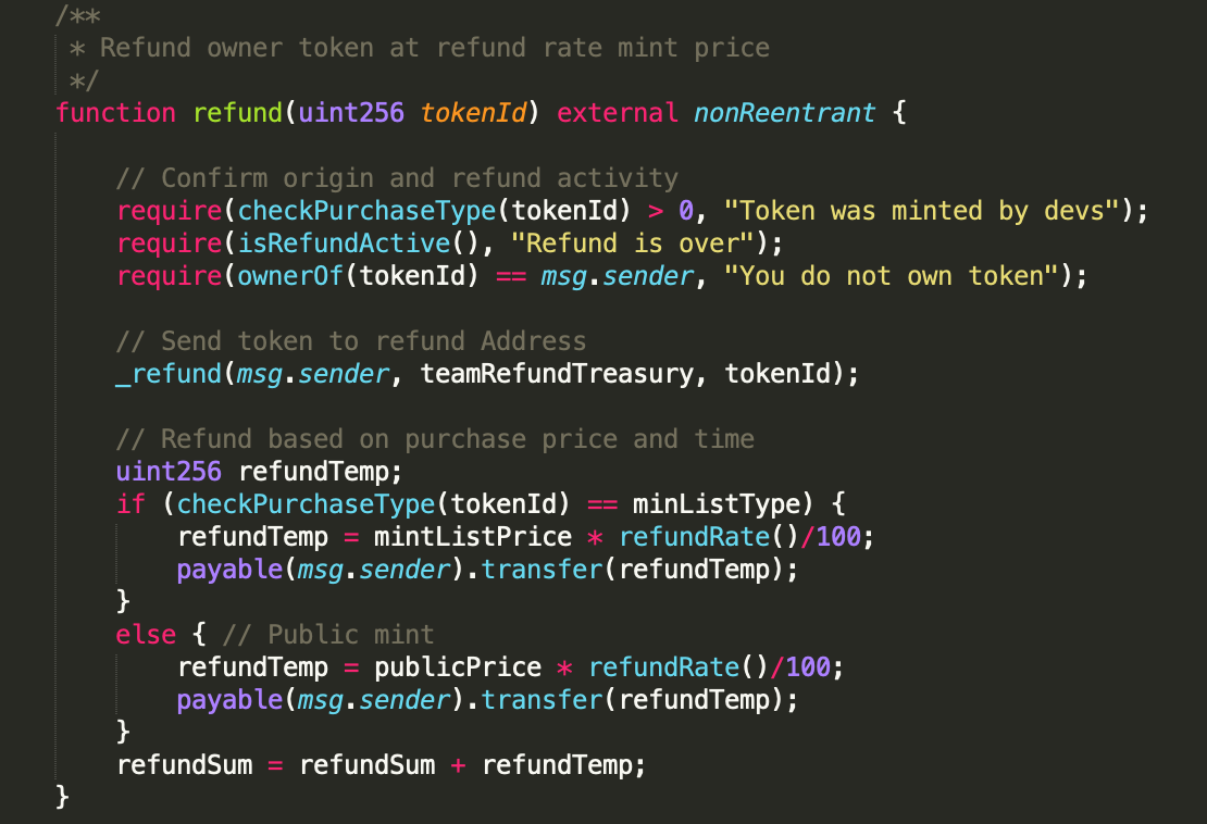 ERC-721R合约的参数是可配置的,允许资金随着时间的推移归属于项目方或者解锁。大多数项目方都将筹集数百万的资金:为归属时间表设定期限,例如每x周解锁x%的资金,这可以让项目方使用一定比例的资金去达成某个阶段性里程碑。同时,达成里程碑也可以让投资者更加相信项目方能够实现其规划。而大多数卷款跑路的项目最终都归0:相较于投资归0,ERC-721R可以项目在mint后一段时间内,仍可以退回NFT并获得80%的退款,这对投资者来说已经是很大的改进了。