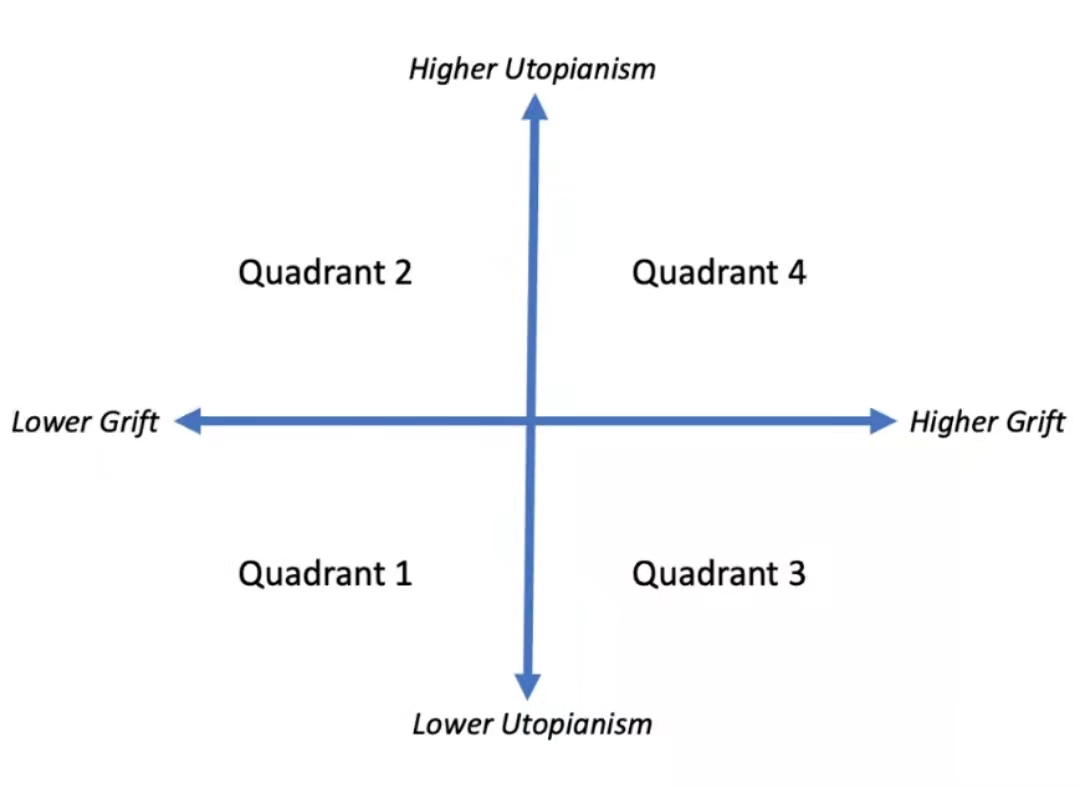 我发现欺骗和乌托邦主义的维度对我们在这个领域中看到的现象具有很大的解释力,循环往复。总而言之,第1象限有良好的长期预期但不适合短期。第2象限假装是第1象限,如果他们解决了可能不存在解决方案的问题,则可以移动到是第1象限。第2象限是短期有利可图的,从长远来看具有更高的风险和更高的回报。第3象限假装是第2象限,但只能对不成熟的玩家的进行成功伪装。第4象限假装是第2象限,如果他们想掩饰事实并在取得一些初步成功后变得合法,他们可能会迁移到第2象限。如果你只关心金钱,它们是迄今为止最好的短期投资,风险投资从这里最大量的访问套利中受益,第2和第4象限是最需要加速的地方。