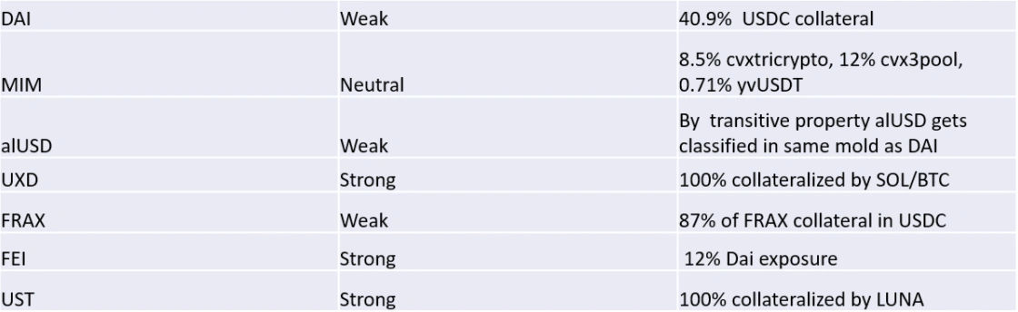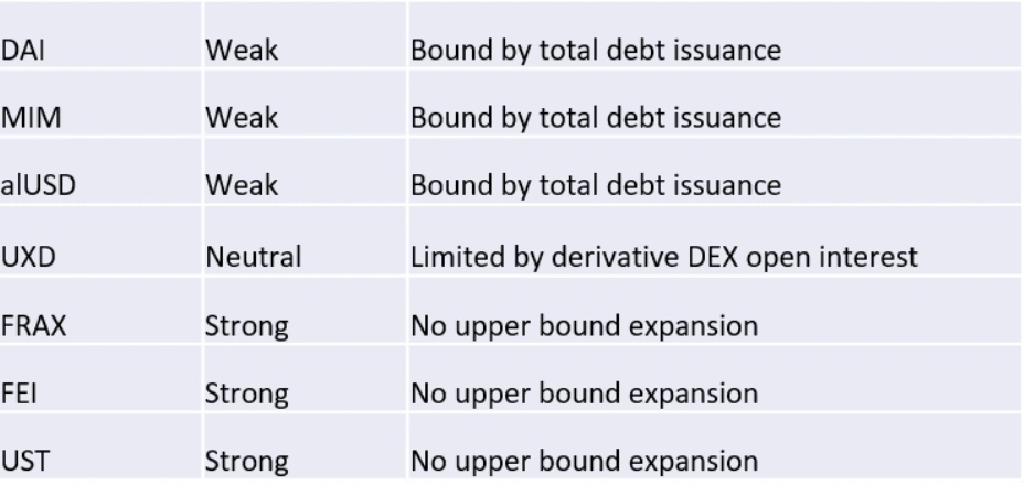 **FRAX:**FRAX在支持其代币的外生 USDC 中具有“强”稳定性。如果价格低于 1 美元,则有直接激励措施,有助于重振挂钩,但其中一个固有问题是,这些激励措施通过协议设计需要一段时间才能生效。