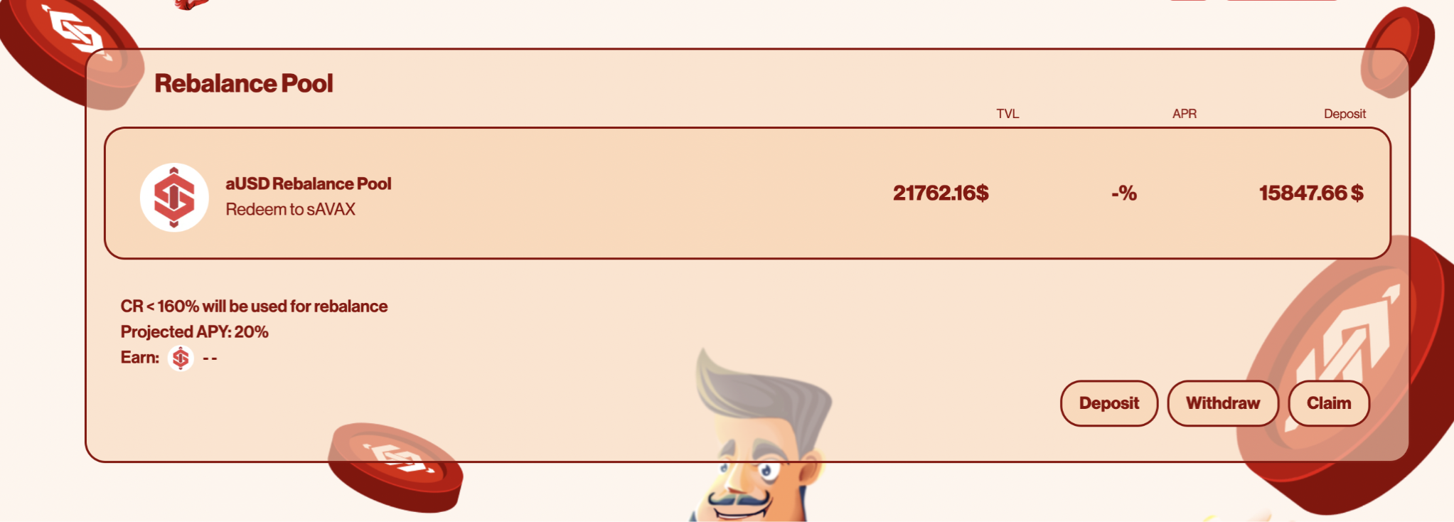 The Rebalance Pool is a vault offered by the protocol where aUSD holders can deposit their aUSD to earn a share of the reserve LSD yields and to be redeemed for sAVAX if the need arises. Depositors in the pool earn a high yield, and if stability mode engages at any point, a portion of their aUSD will be redeemed for sAVAX. sAVAX redeemed from aUSD is owned by the Rebalance Pool depositor so that you won’t lose your capital. Depth liquidity in this pool ensures the protocol has access to sufficient aUSD to stabilize the protocol when needed.