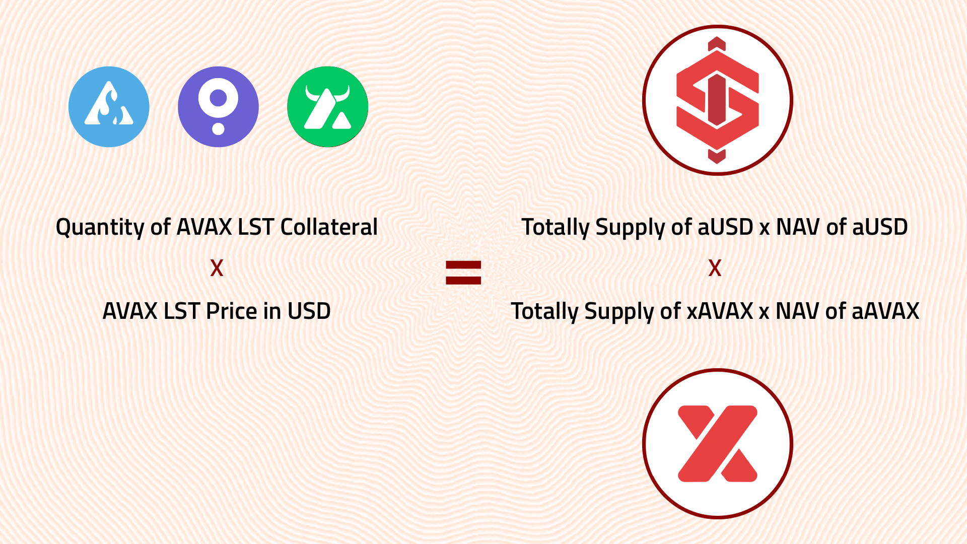 The quantity of AVAX LST Collateral × AVAX LST Price in USD = (Total Supply of aUSD × NAV of aUSD) + (Total Supply of xAVAX × NAV of xAVAX).