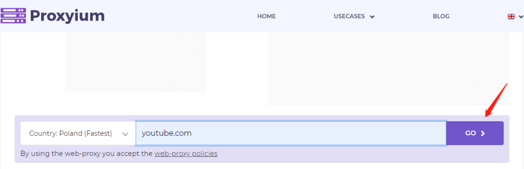 Visit the official website at https://proxyium.com/. Ignore the ads and focus on the purple section, where you can select a country and enter a URL to start browsing.