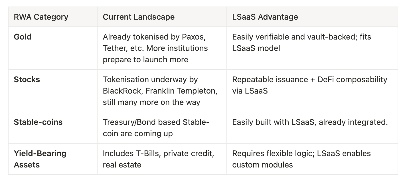 What makes this powerful is that it all runs on the same LSaaS infrastructure already battle-tested in staking. With only minor adjustments in modules—such as legal verification and custodial integration—the system becomes fully adaptable for real-world assets like stocks.