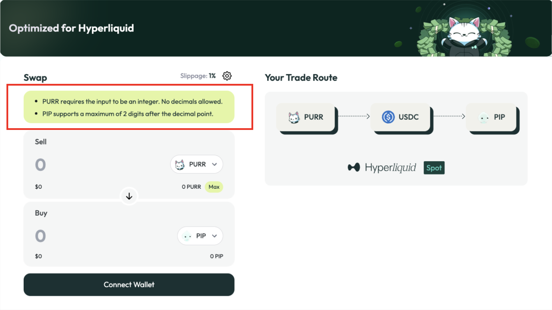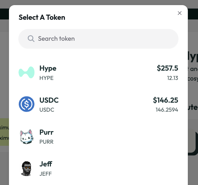 Decimal Support Display: Clear text shows each token's supported decimal precision. (Note: Due to Token Tick Size on Hyperliquid, some tokens require rounded amounts, while others accept decimals.)