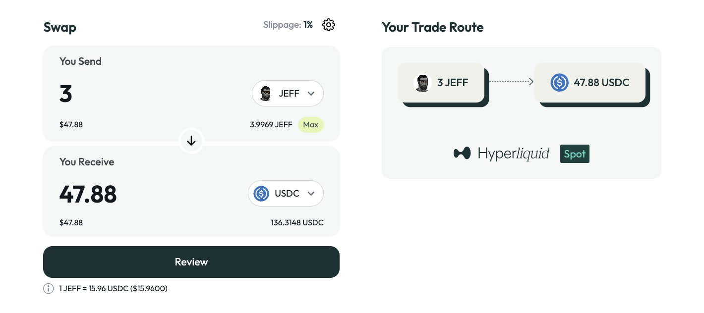 “Is this because Hyperliquid only allows a round amount of token in spot transactions? So we have to round down the amount (47.8739 to 47). However, just from a UX point of view, I feel having two more numbers in ‘Trade Route’ seems redundant and more confusing somehow. IMO, ‘Trade Route’ is a good feature, but we don’t need to have the figures in there. If we need to present the rounded figures, we should put them in the main swap box somehow.” - from sronoz