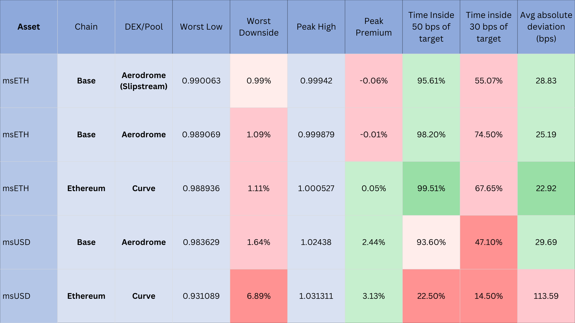 Peg stability matters because msAssets are commonly borrowed for loops and other strategies. When the price drifts away from $1, strategy returns can be distorted. For example, borrowing well below peg and later unwinding at peg can erase a meaningful portion of the position. In August, msETH pools on Base (Aerodrome) and Ethereum mainnet (Curve) tracked close to parity for most of the month. msUSD on Base was similarly orderly, while msUSD on Ethereum showed wider excursions.
