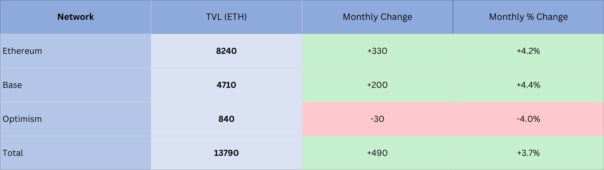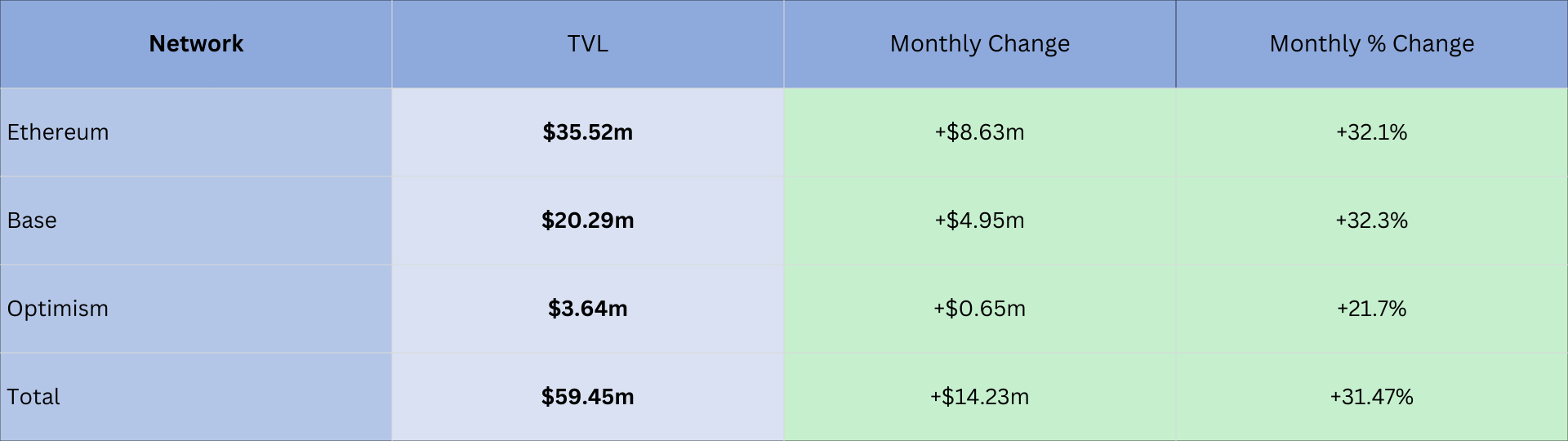 Examining ETH-denominated TVL, we see that ETH’s appreciation explains some of the TVL growth shown in the previous table. Most of the increase occurred on Ethereum and Base, consistent with Odyssey’s footprint. More loops meant more msETH minted and/or borrowed, which increased on-chain balances independent of ETH’s USD price. Optimism trails, matching lighter Odyssey routing there.