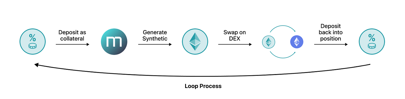 When you deposit assets into yield-earning pools like Vesper Grow Pools, you gain a distinct advantage as you are issued pool share tokens that reflect your position’s weight. These can be utilized further and deployed to synthetic protocols to maximize their potential and increase exposure. Generating synthetics to swap on the open market can be put back into the original position to increase APY potential.