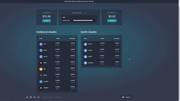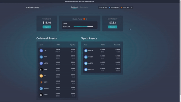 5. Once confirmed, you will see your collateral displayed on the dashboard, now you can decide which synths you would like to generate.