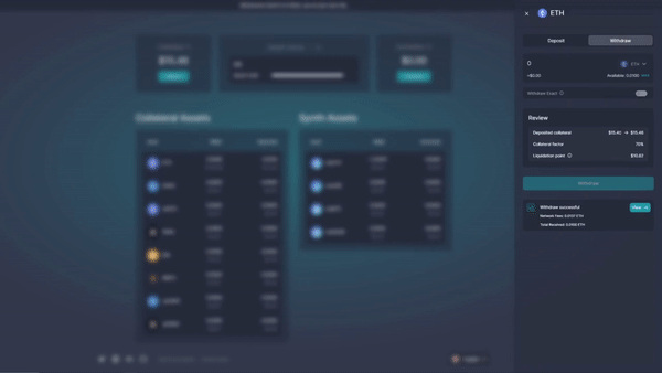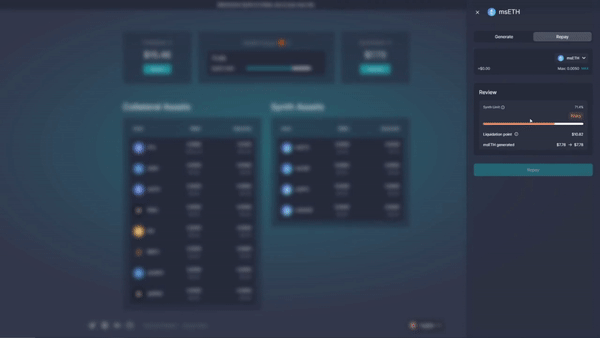8. Once you are happy, you can visit the dashboard to view all your details, such as collateral, health factor, and synthetics. Clicking on the health factor will bring up a more in-depth view of your collateral against your synthetic assets.
