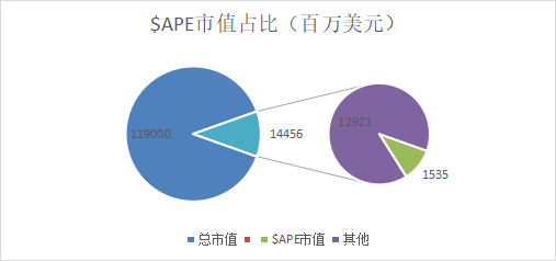 1)目前市场总市值为 $14,456,044,439(代币市值),占代币市场总市值0.12%,其中 $APE 作为贯穿猴子宇宙生态的代币,其市值为 $1,535,957,125, 占整个市场市值的9.3%;