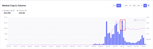 2)值得注意的是,当时猴地开售前后,其他NFT均有不同程度的下跌,虽然当时仍然处于牛市,但是猴地的总体市值偏大,占据了NFT大量的流动性,导致之后市场包括猴地出现了大幅度的回调,这种占用大量流动性的操作,最终引火上身致使其在半年内,下跌将近60%;