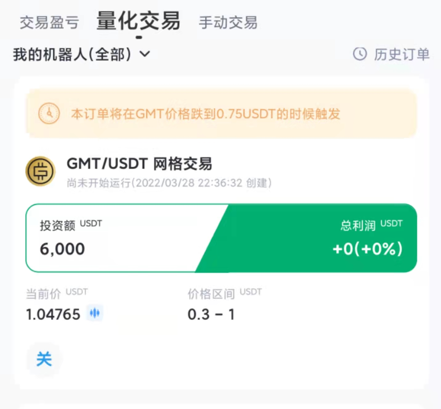 第二步:再用剩余的30--50%资金建一个网格单抄底。价格下限为当前价的0.2--0.3,价格上限为当前价,触发价为当前价的0.8左右。