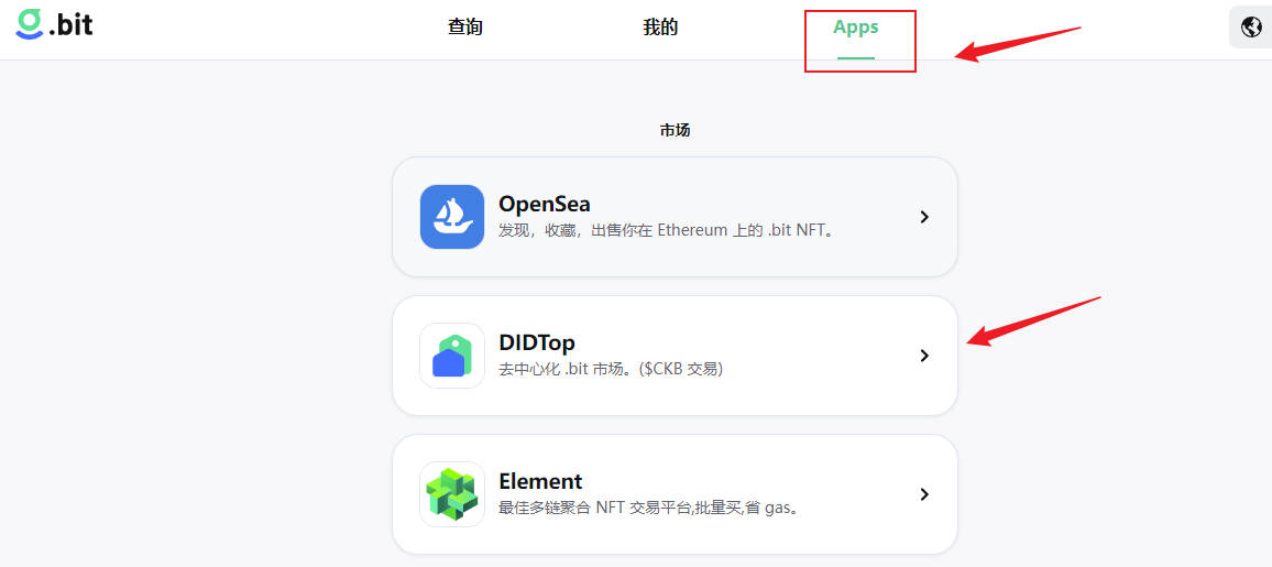 在DID网站内,我们DAPP,可以进入支持.bit域名的Dapp。其中最上面三个就是交易平台,不过Opensea和Element需要我们把域名转成NFT才可以,而DIDtop可以直接交易.bit域名。