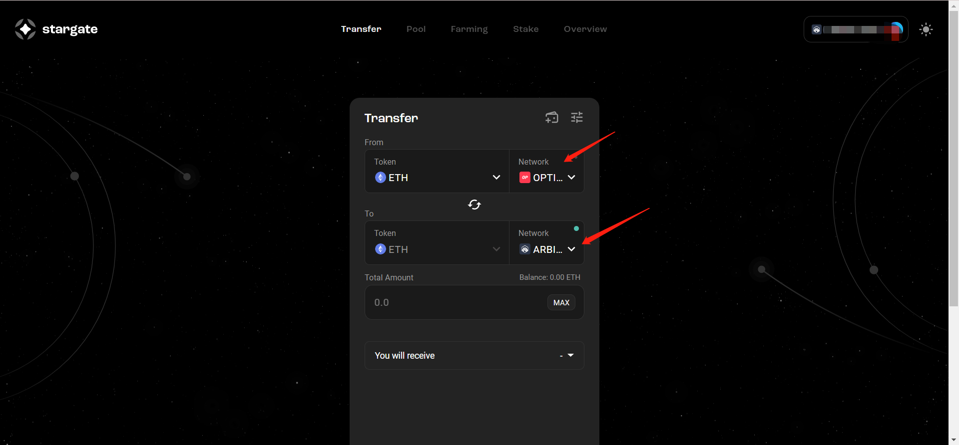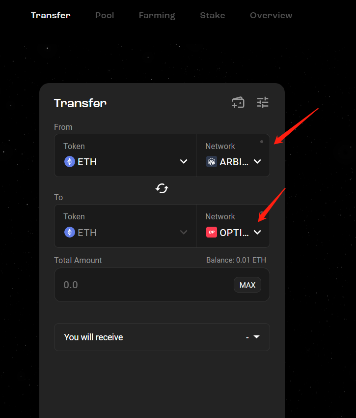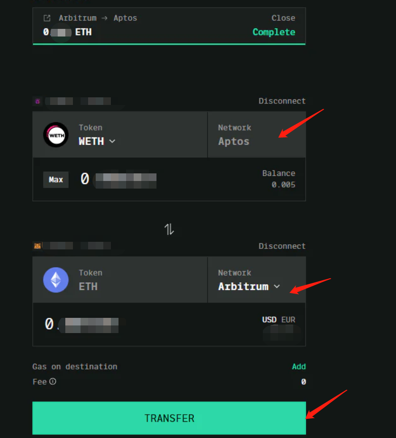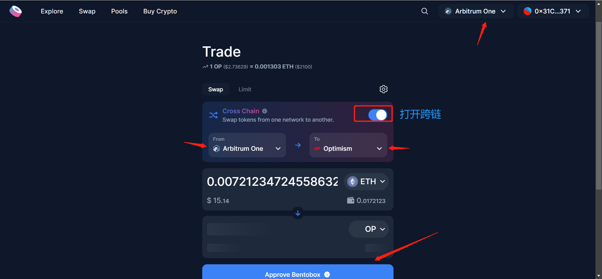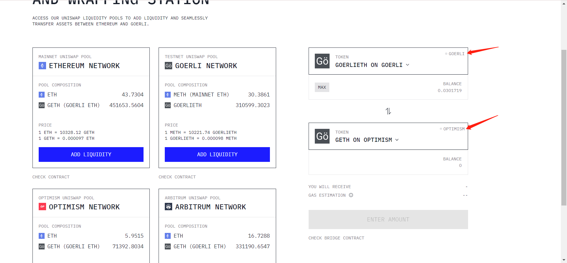做这一步的时候,很多朋友不会跨回去。选择op/arb的ETH换geth