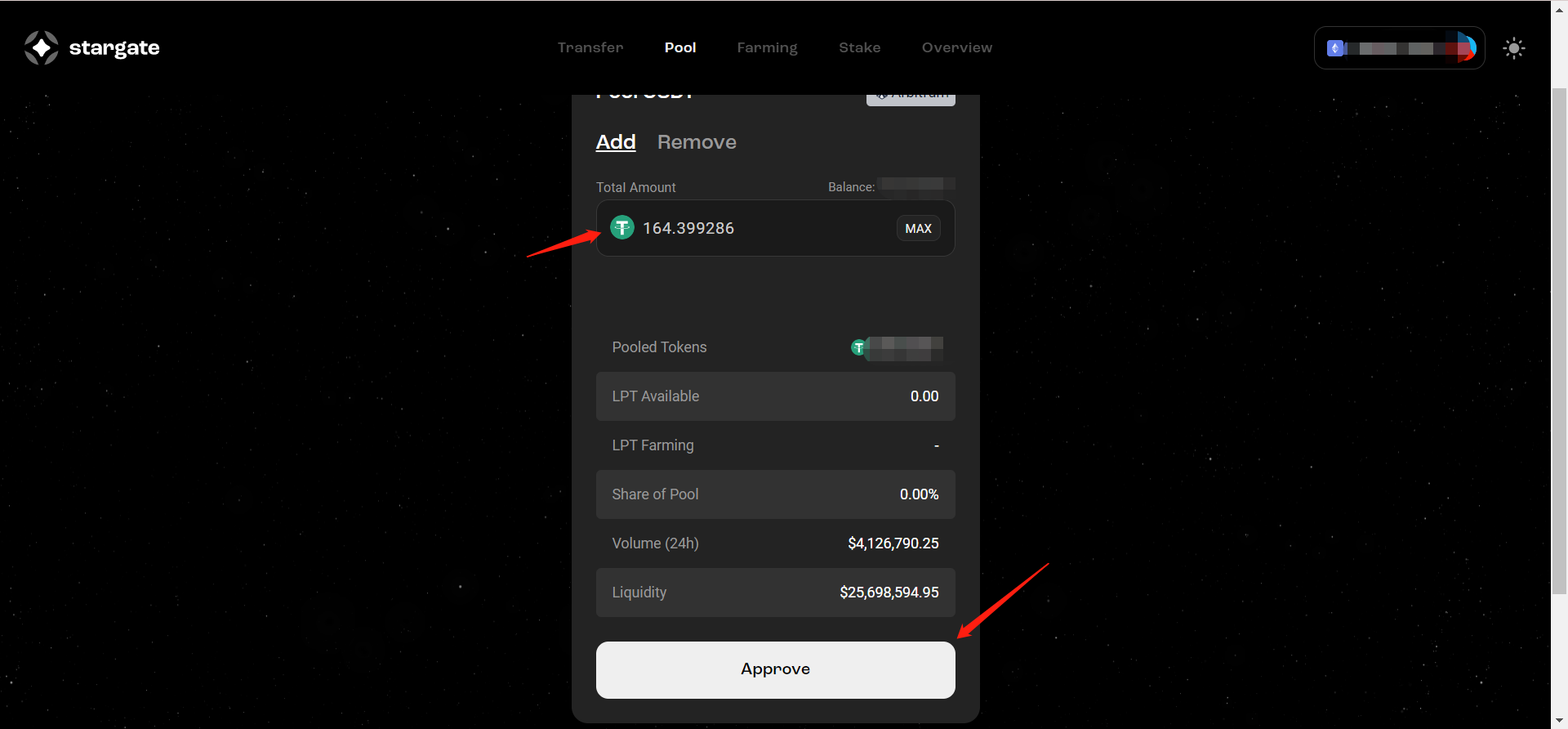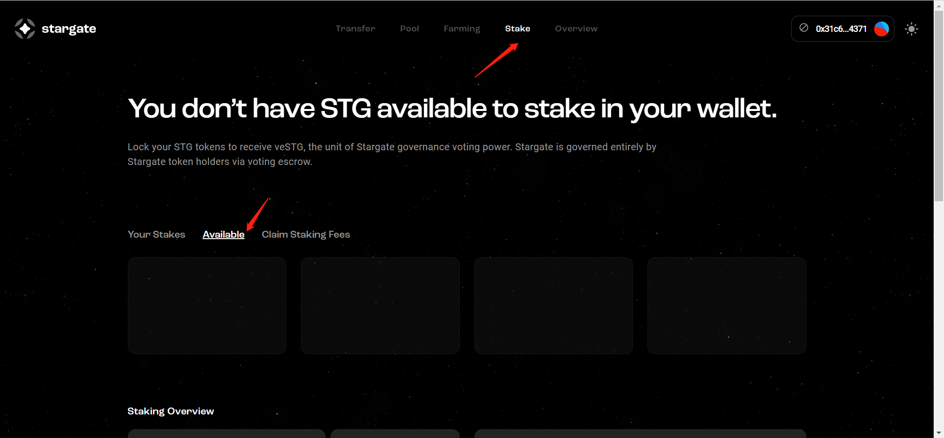 这一步需要提前购买stg,如果没有可以从交易所买了提