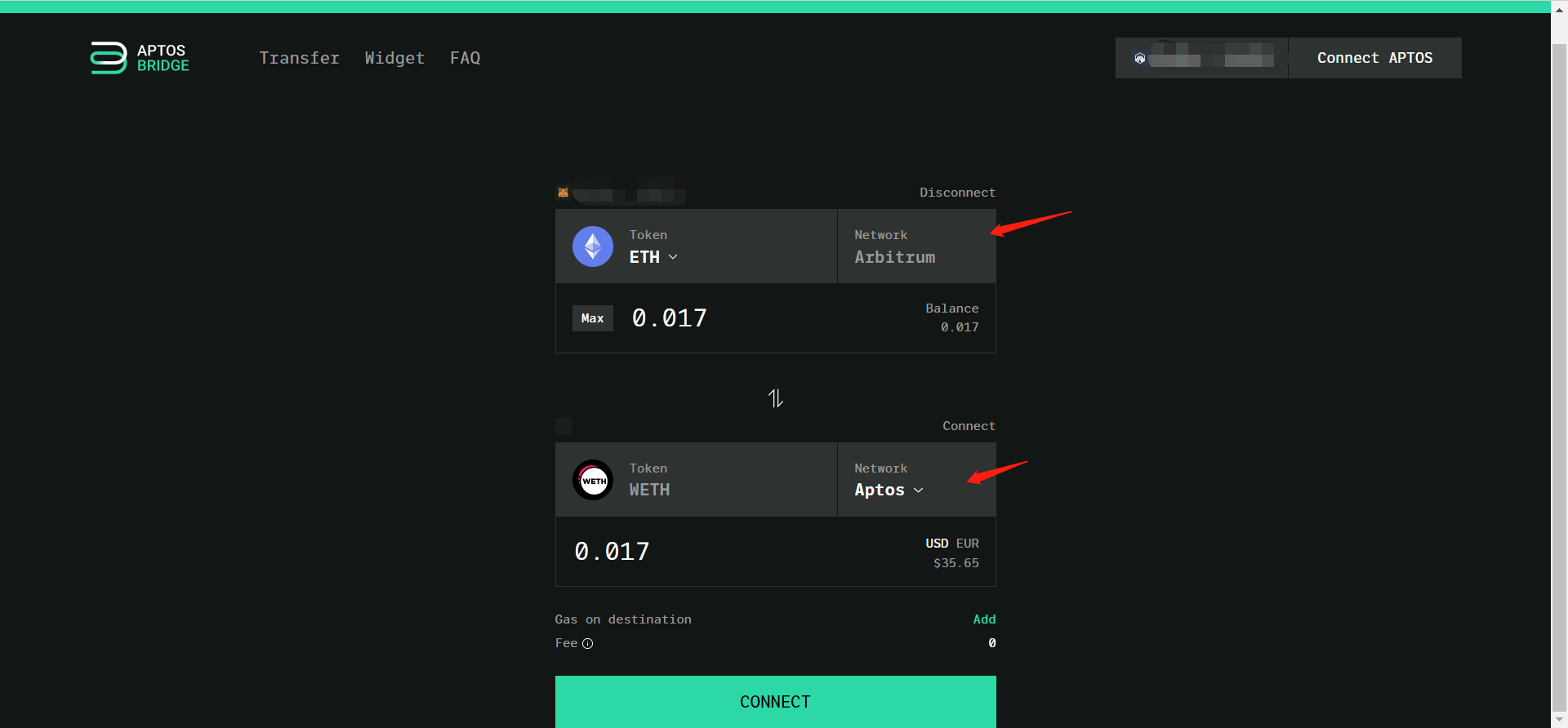 到账时间需要等待一会,这个时候pontem钱包会自动送一点aptos做gas,收到gas后需要回到网站点击一下claim,只有点了Eth才能到账