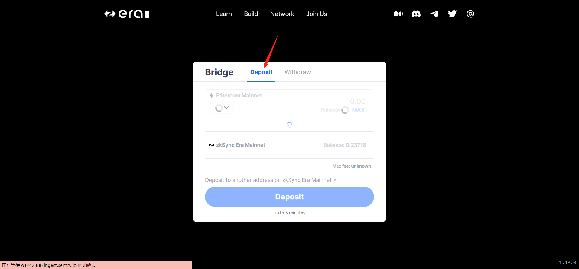 ETH主网选择跨链的金额,输入完成后点Deposit