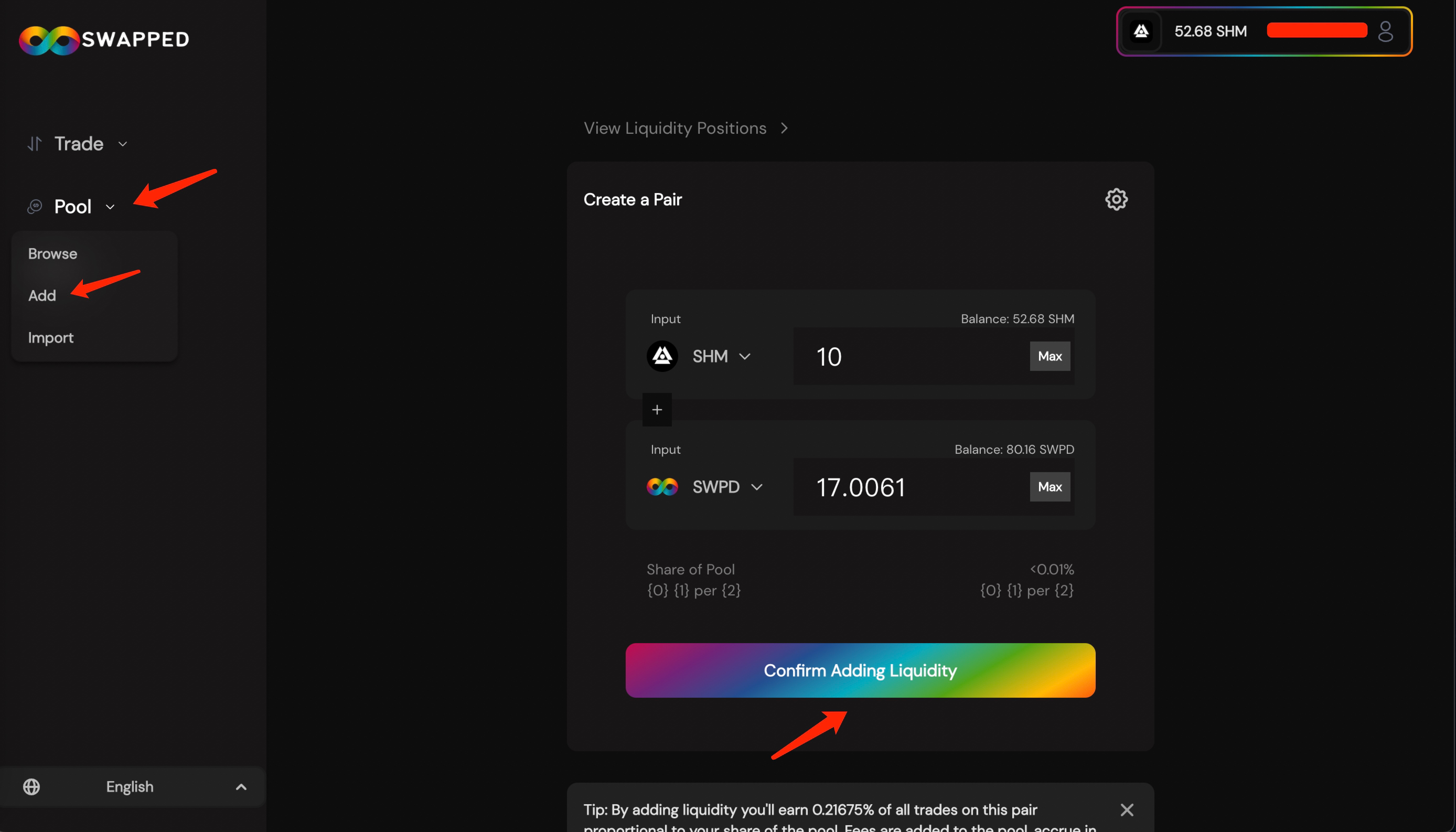 5 添加流动性(选池子点击添加,输入数量确认增加流动性