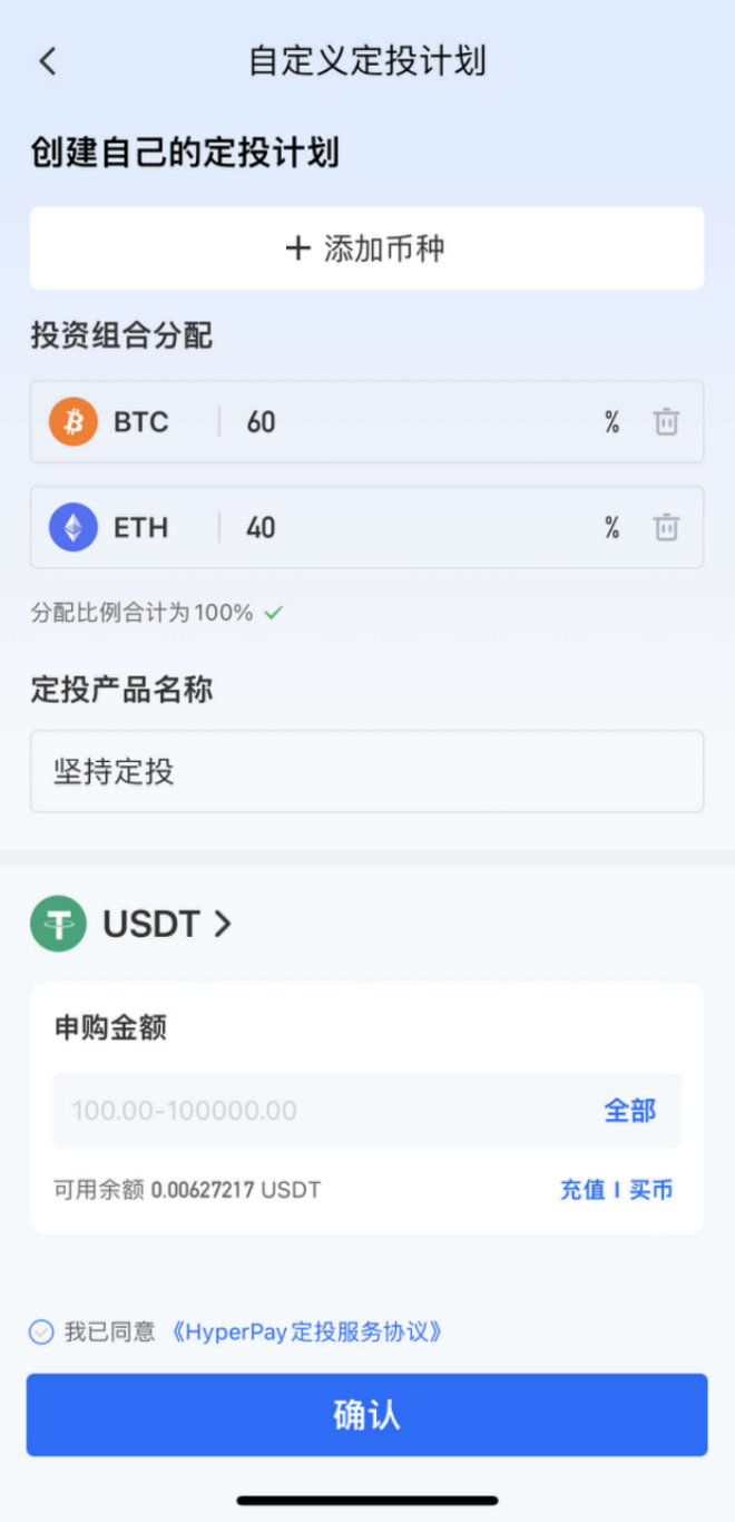 HyperPay智能定投策略分为两种,单币定投和组合定投: