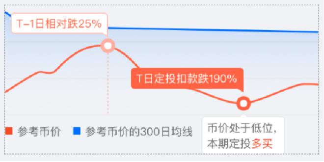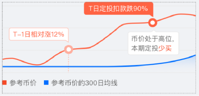智能定投采用均线定投策略,又称均线偏离策略。是根据扣款日前1天定投代币的价格相对于该代币300日均线的偏离程度,来确定当期具体定投金额,智能定投为定期不定额理财产品。