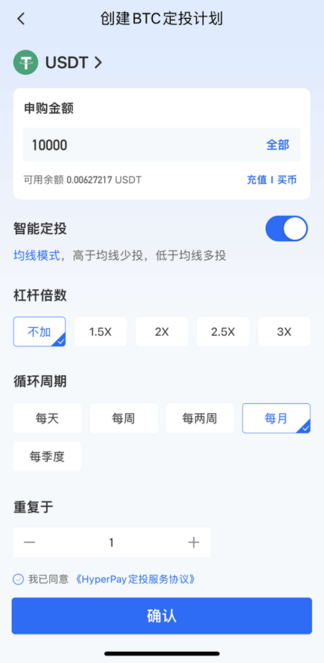 HyperPay智能定投将为用户提供1-3倍的杠杆,用户可以以较低的利息去撬动更大的收益,这是市面上其他产品所不具备的功能。