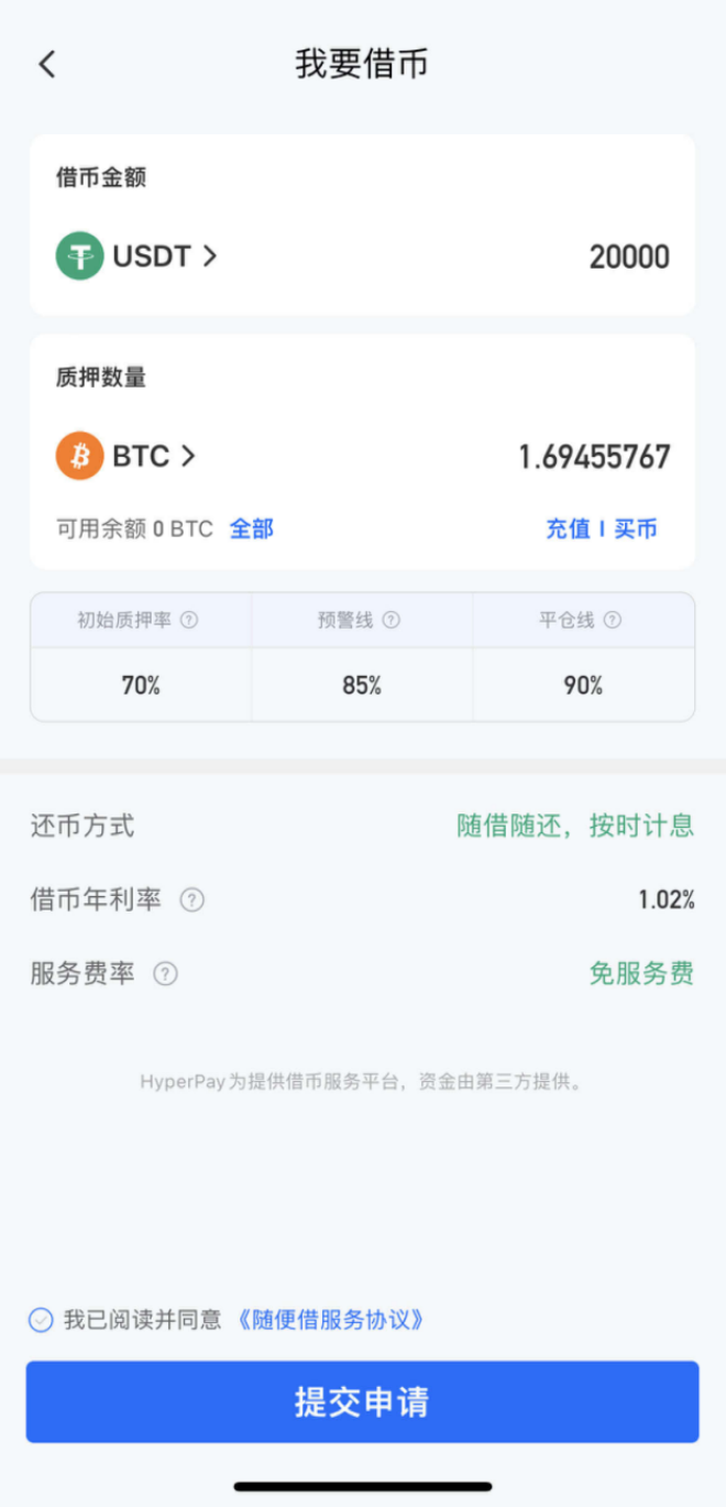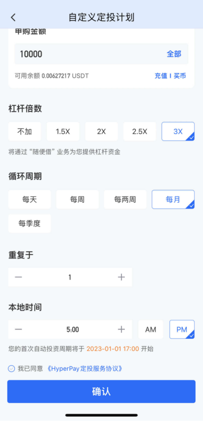 用户可设定定投金额和循环周期,并设置在何时买入,用户可以勾选杠杆也可以不勾选杠杆,勾选杠杆的话,如勾选3X杠杆,用户申购金额10000USDT,杠杆倍数3倍,借币金额=10000*3-10000=20000USDT,该金额将由随便借产品提供,抵押资产将由用户本身所定投购买的资产决定,借币年利率仅1.02%: