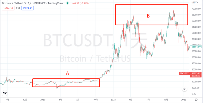 而从市场周期规律来看,熊市是最适合定投的时间节点,只有在熊市积累足够多的筹码,才可以在牛市获得最大化的盈利。以史为鉴,在市场情绪低落的2020年前后,即A区域,用户有充分的时间去积累筹码,仅仅过去了一年多的时间(B区域),BTC的价格就坐上了快车道,用户最少也获得了3倍的收益: