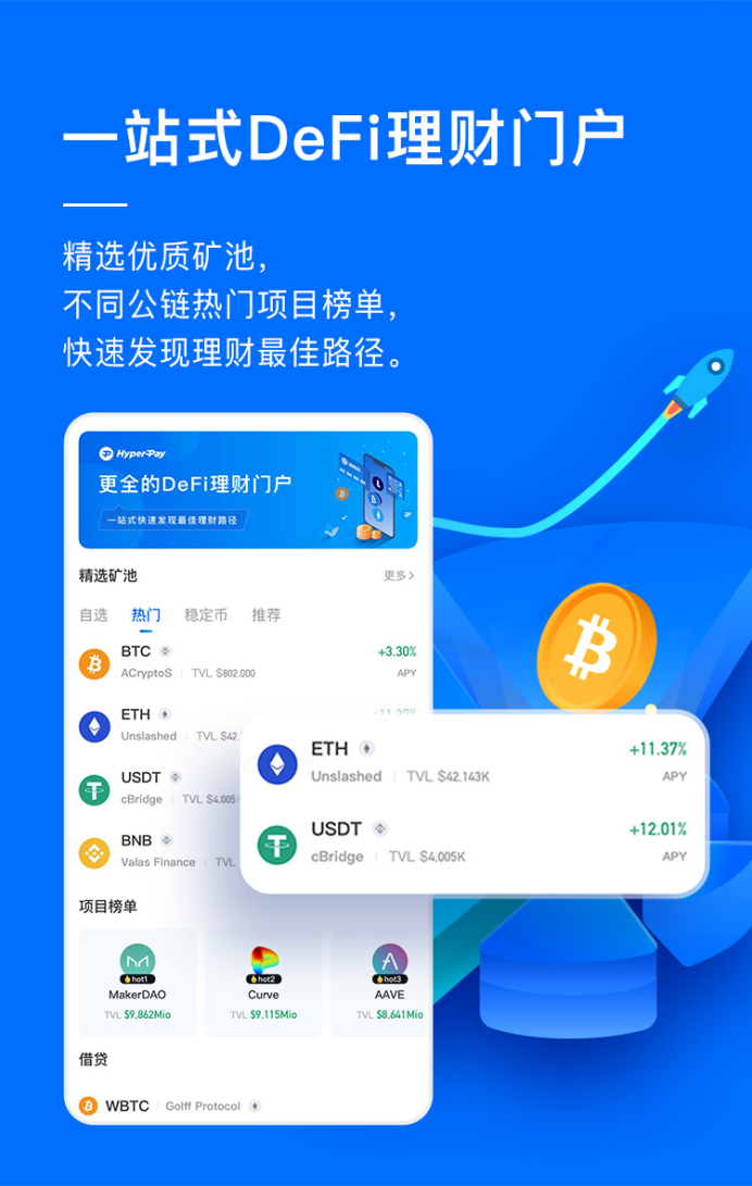 升级后HyperPay托管钱包的理财产品依然丰富,币贷宝、币增宝、PoS矿池、DeFi理财、HBT机枪池、超短期及中长期定期理财等,不同形式不同期限,各项收益都十分可观,其中HBT机枪池收益12.12%起,锁仓收益翻倍,最高可达250.12%。